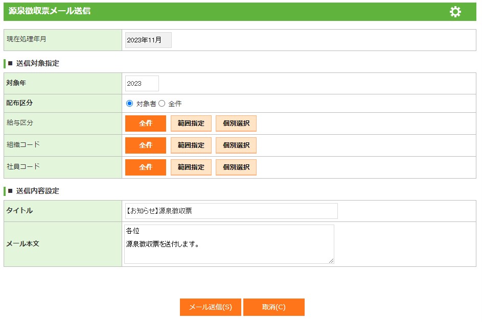 源泉徴収票(Web公開用)一括作成(3.6.20)で作成した源泉徴収票のPDFファイルをメールに添付して、各社員へ送信します。