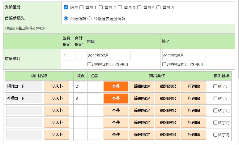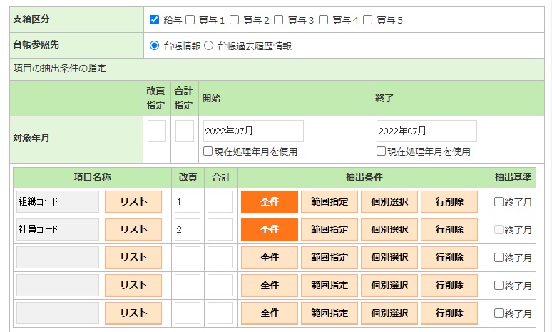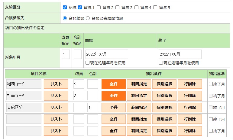 抽出条件/範囲指定の初期値は、帳票IDを最初に登録した際に設定した値になります。
