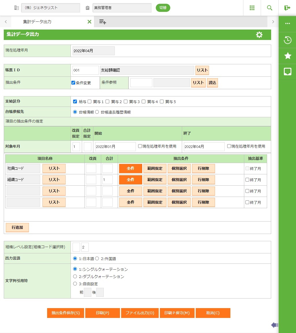 ・ 組織コードを範囲指定、個別選択した場合、選択した組織の下位組織も出力対象になります。