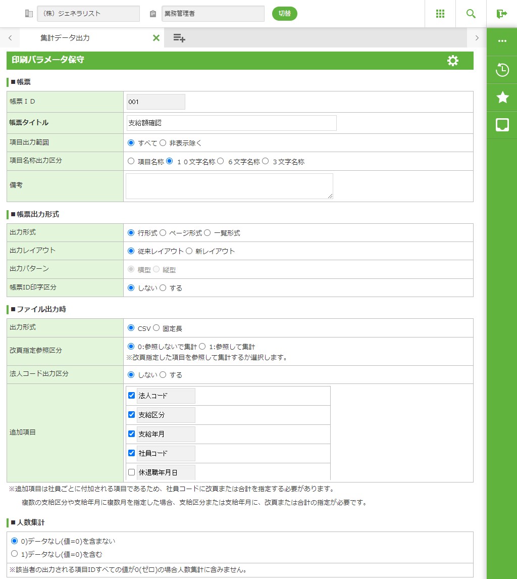 帳票出力する際の人数集計を0)データなし(値=0)を含まない、1)データなし(値=0)を含むから選択します。 |