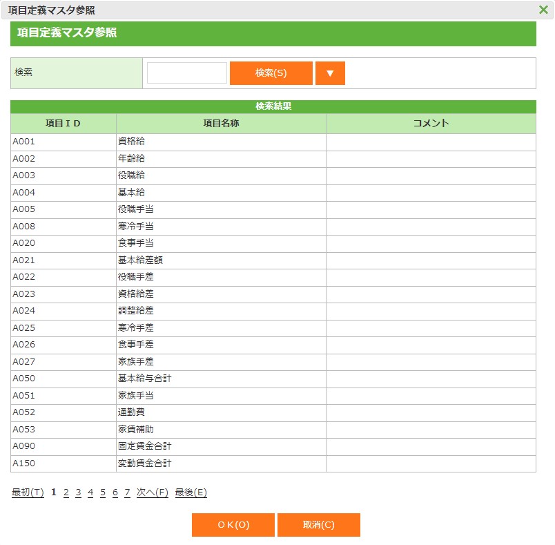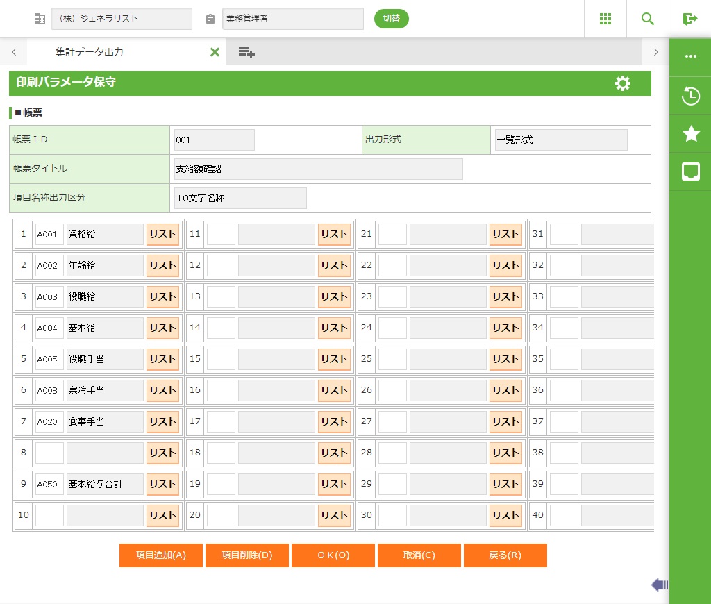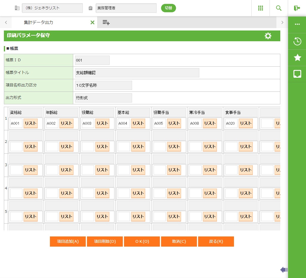 一覧形式の帳票に出力する項目IDを入力します。項目名は、印刷パラメータ保守基本情報画面の「項目名称出力区分」で選択した項目名称で表示します。 |