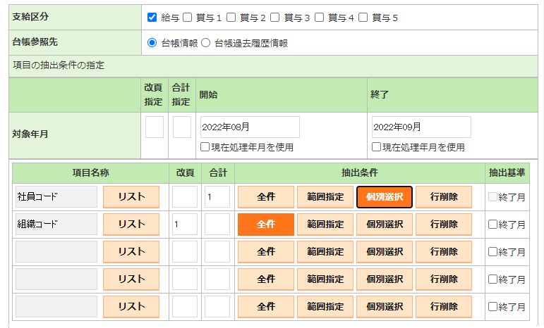 レコードを分けずに対象年月(終了)時点のデータで集計する場合は、抽出条件設定・処理実行画面の「終了月」にチェックしてください。