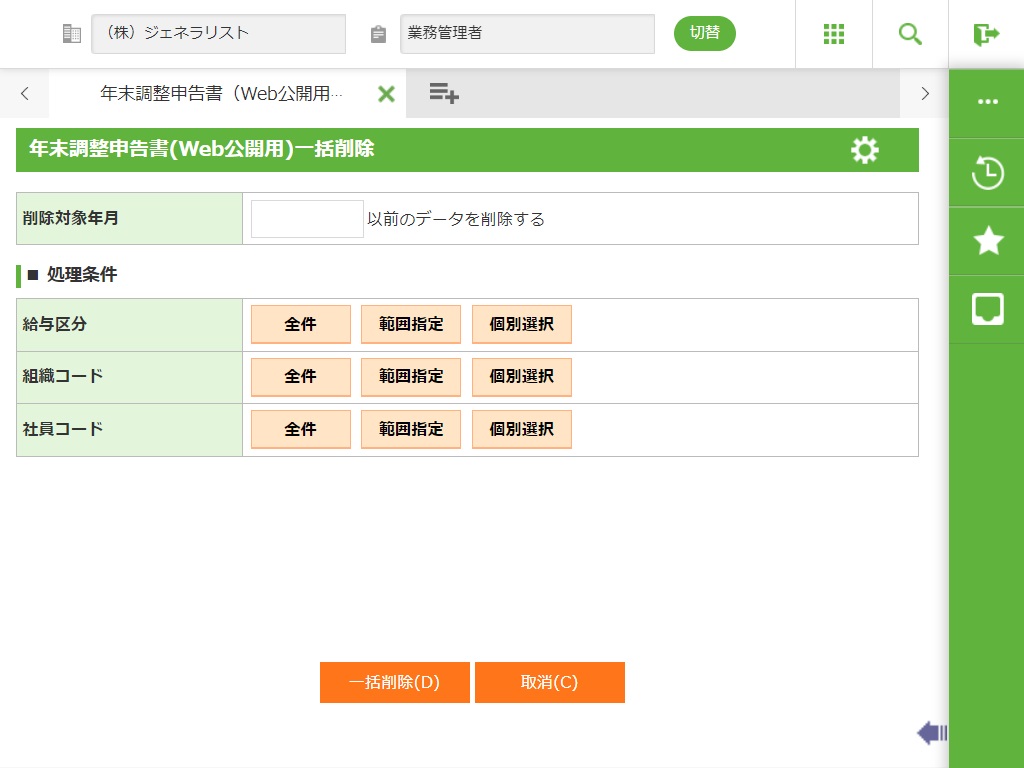 年末調整申告書(Web公開用)一括作成で作成したPDFを一括で削除する機能です。