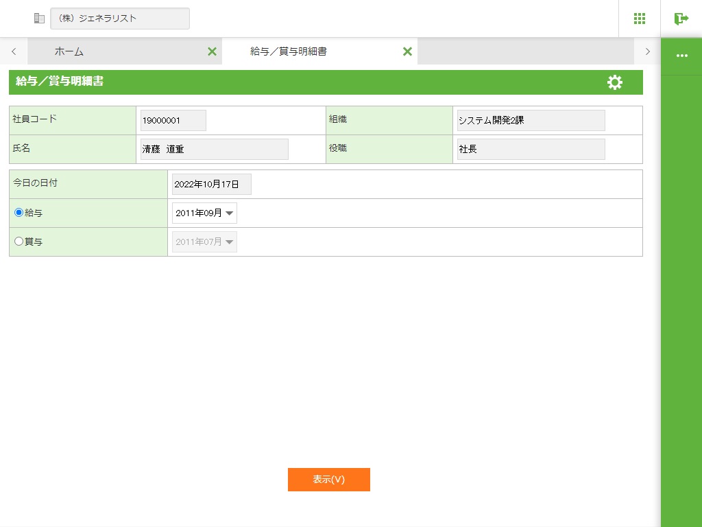 個人ログインIDでログインした利用者の給与または賞与明細書を閲覧することができます。個人ログインIDでログインした場合に限り、メニューに表示されます。