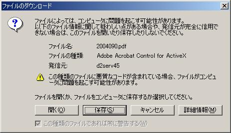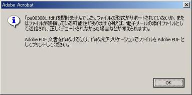・ 「表示」ボタン押下時に下図のようなメッセージが表示される場合は、以下に示す手順でAdobe Readerの設定を変更してください。
