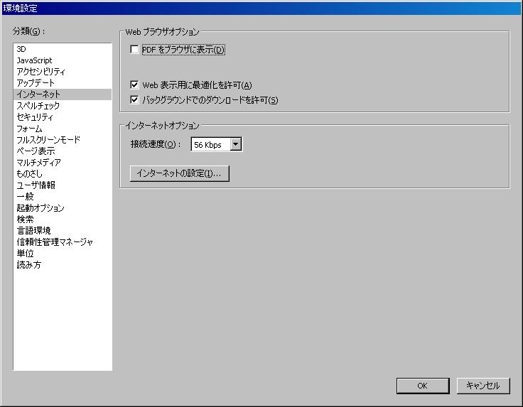 2.左側のメニューから「インターネット」を選択し、右の設定画面で「PDFをブラウザに表示(D)」のチェックボックスのチェックを外します。