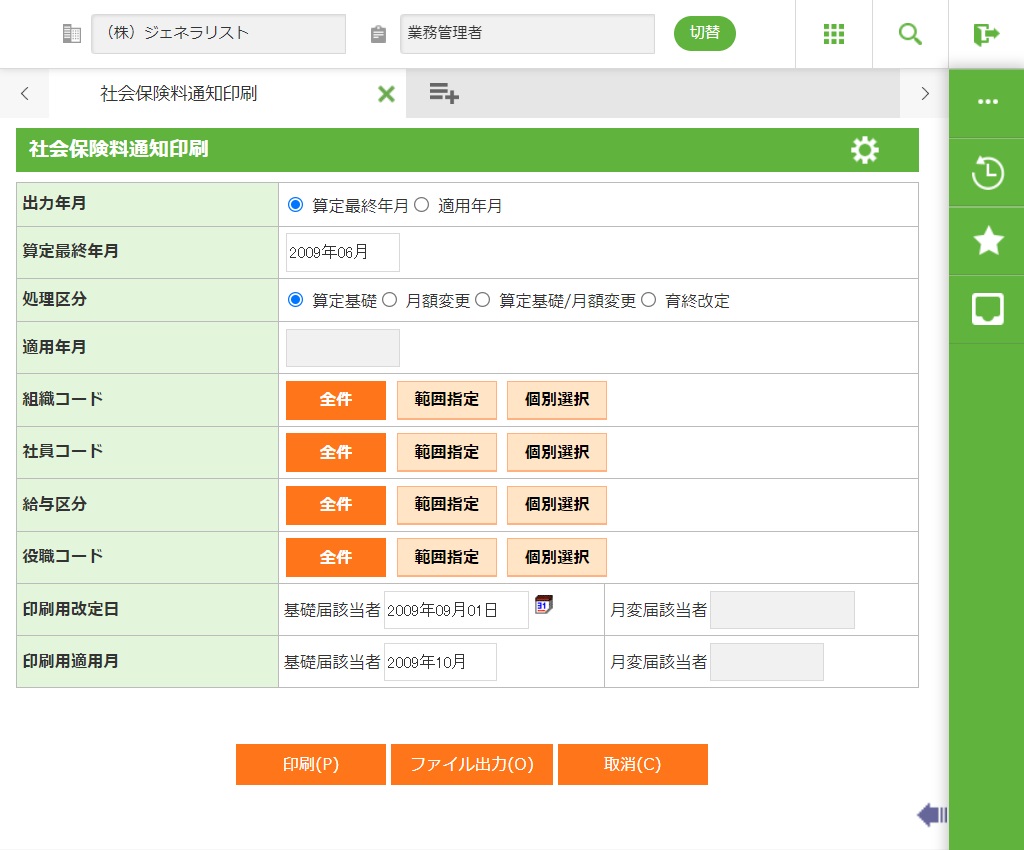 ・ 画面の出力年月で適用年月を選択した場合、適用年月時点の保険料率で算出しなおし出力します。(テーブルへの更新は行っておりません。)対象が保険料を支払う全社員になりますので、社員を特定したい場合、組織、社員等を選択して出力してください。