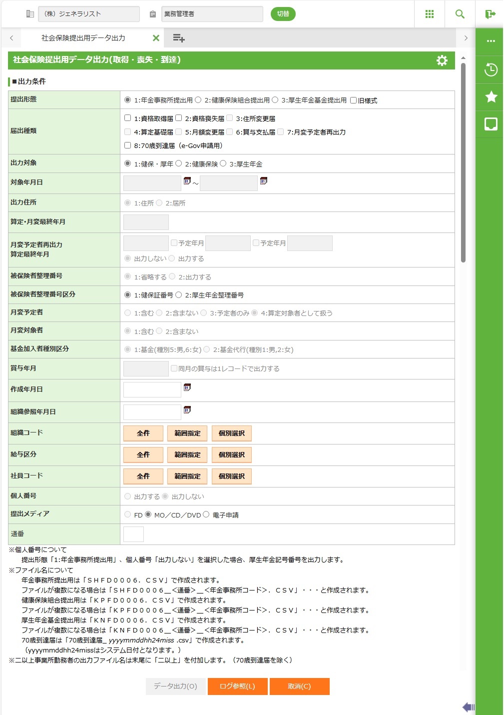 表示されている設定で届出データの出力を開始します。 出力する届出種類により、以下の項目を入力します。 1:資格取得届…対象年月日(開始、終了)、基金加入者種別区分 2:資格喪失届…対象年月日(開始、終了) 8:70歳到達届(e-Gov申請用)…算定・月変最終年月 ※出力対象、提出年月日は必須です。 ※通番は、何も入力されていない場合は、前回からの続きの番号を自動で設定します。 ※出力ファイルは、年金事務所毎に出力します。ファイル名は、「固定ファイル名_通番_年金事務所コード」となります。提出メディアが「電子申請」の場合は、「法人コード_固定ファイル名_通番_年金事務所コード」となります。 |