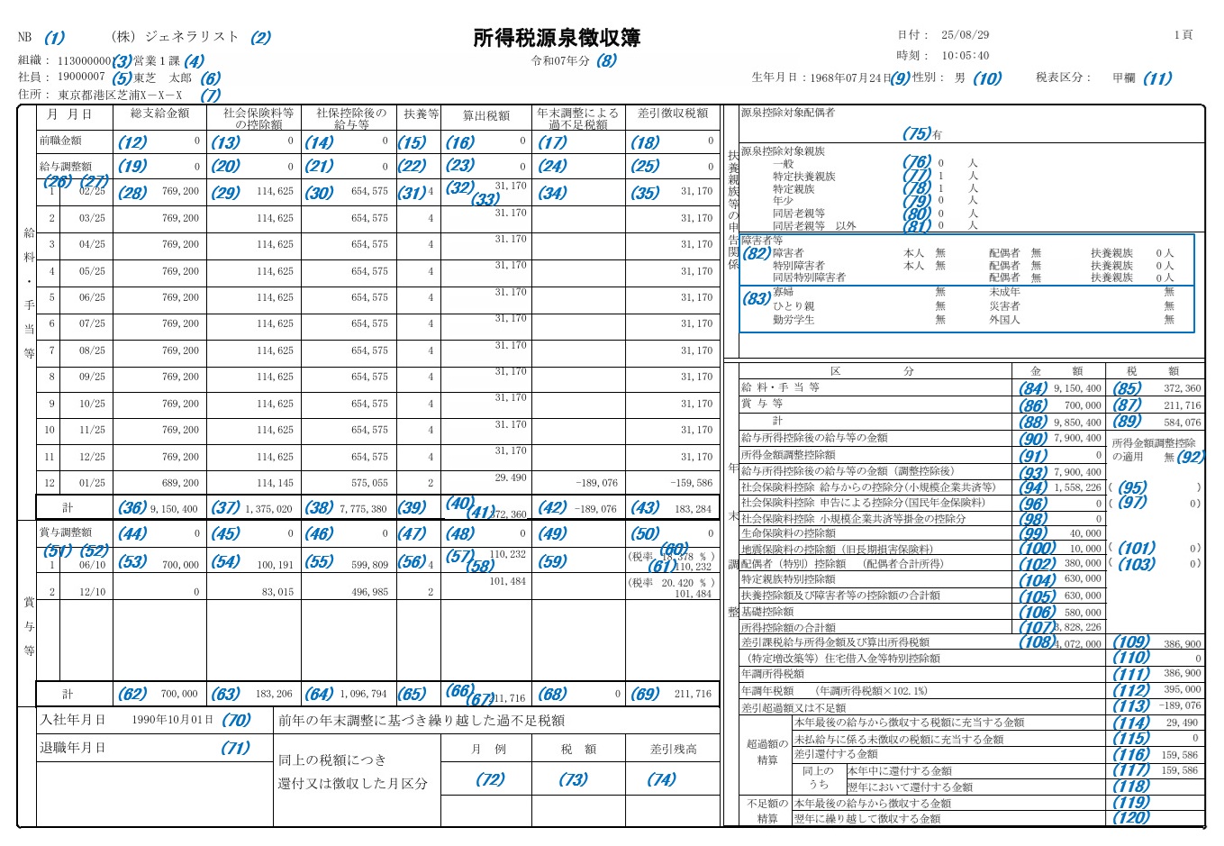 台帳情報(テーブル)>(給与システム管理マスタに登録されている項目IDの年調年月の項目値)源泉所得税 |