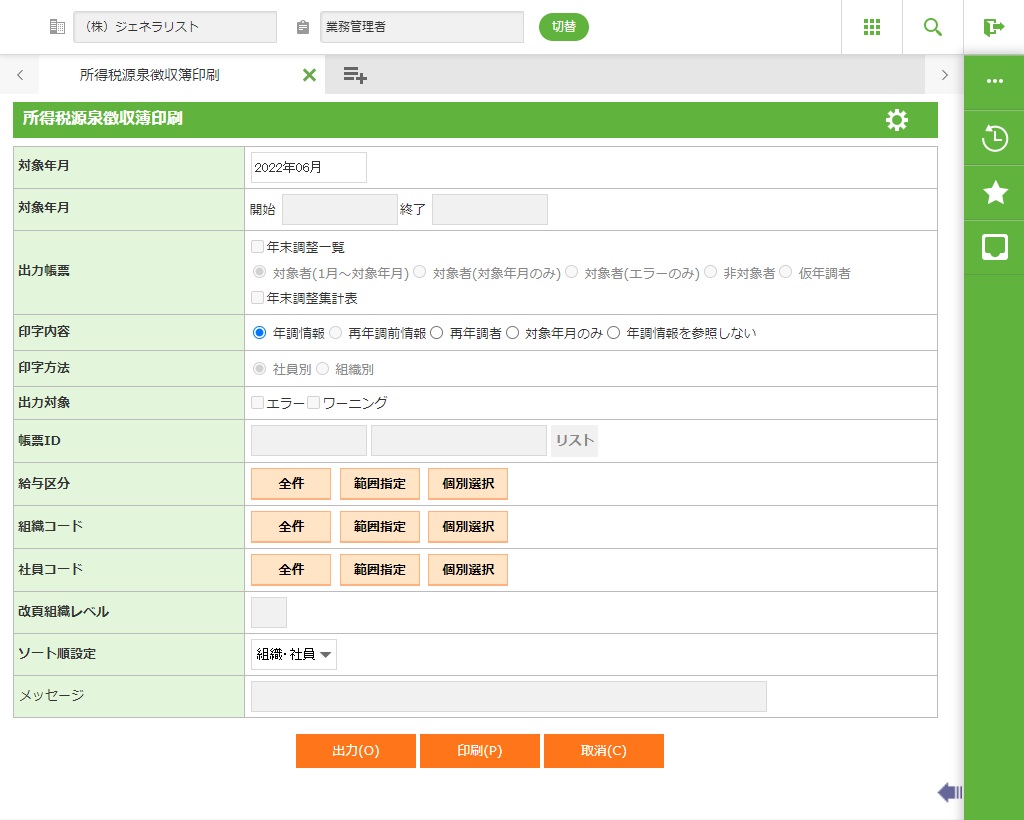 ・ 出力時に「対象年月のみ」を選択した場合は、画面で入力した対象年月の年月と合致する社員の情報を印字します。