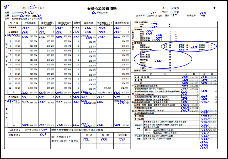所得税源泉徴収簿印刷画面の対象年月に2012年以前を指定した場合、所得税源泉徴収簿は以下のレイアウトで出力します。