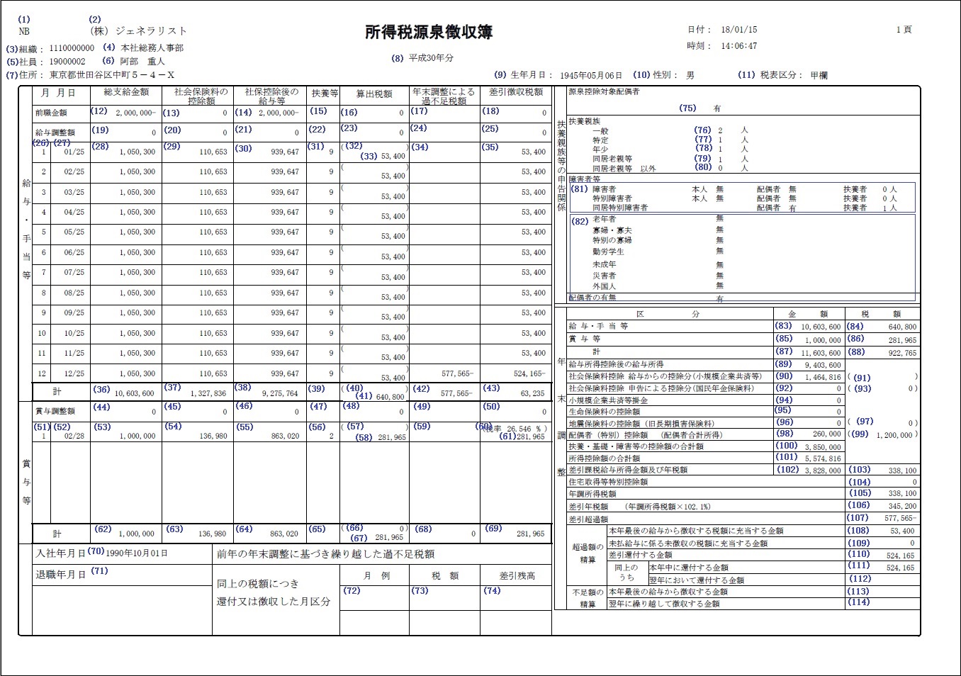 所得税源泉徴収簿印刷画面の対象年月に2019年12月以前を指定した場合、所得税源泉徴収簿は以下のレイアウトで出力します。