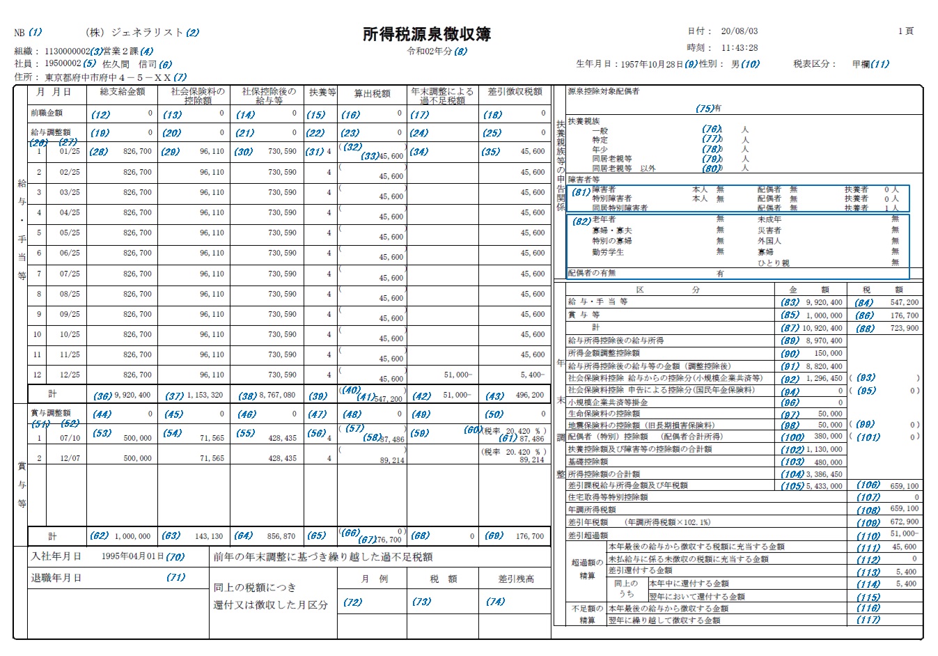 所得税源泉徴収簿印刷画面の対象年月に2020年12月以前を指定した場合、所得税源泉徴収簿は以下のレイアウトで出力します。