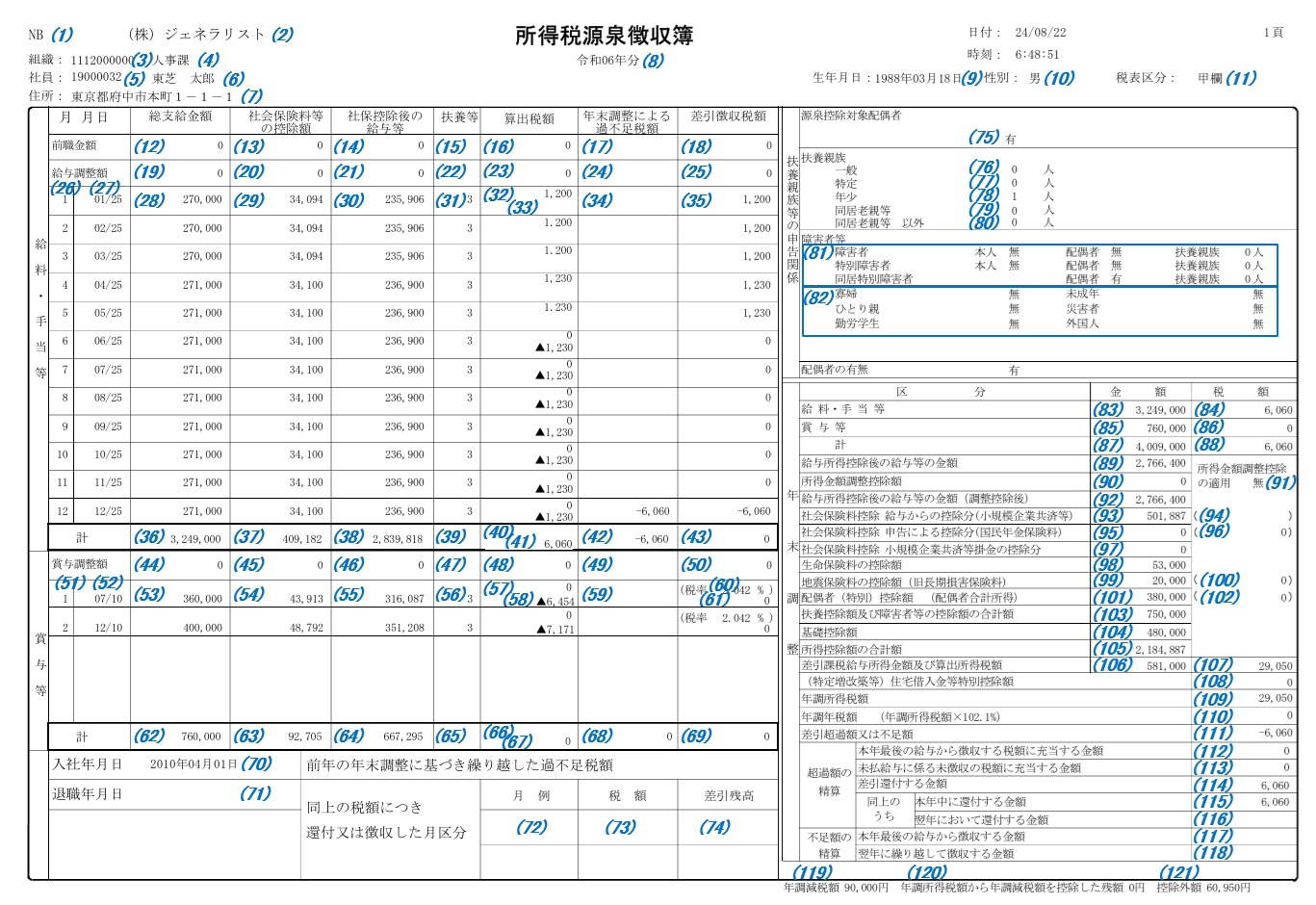 所得税源泉徴収簿印刷画面の対象年月に2025年11月以前を指定した場合、所得税源泉徴収簿は以下のレイアウトで出力します。