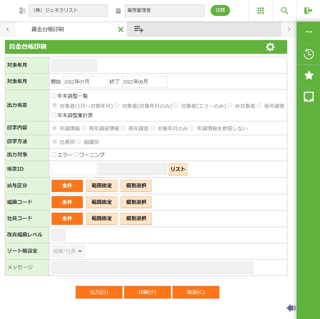 出力する項目は「3.6.24 賃金台帳 印刷P設定」にてあらかじめ設定をしてください。
