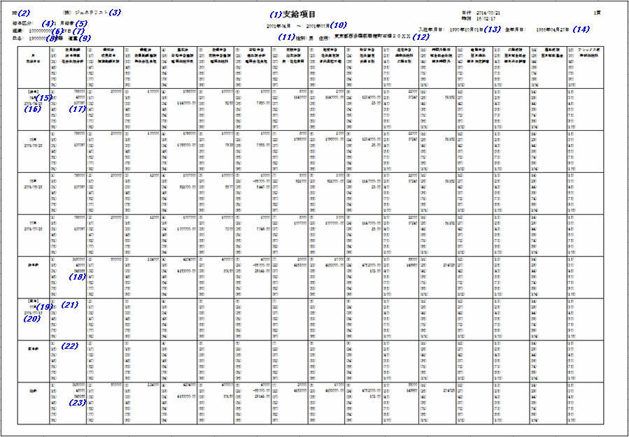 ・ 賃金台帳表示の合計欄に関しては、選択した項目の台帳情報の値の内、支給区分、支給年月をキーに集計しています。