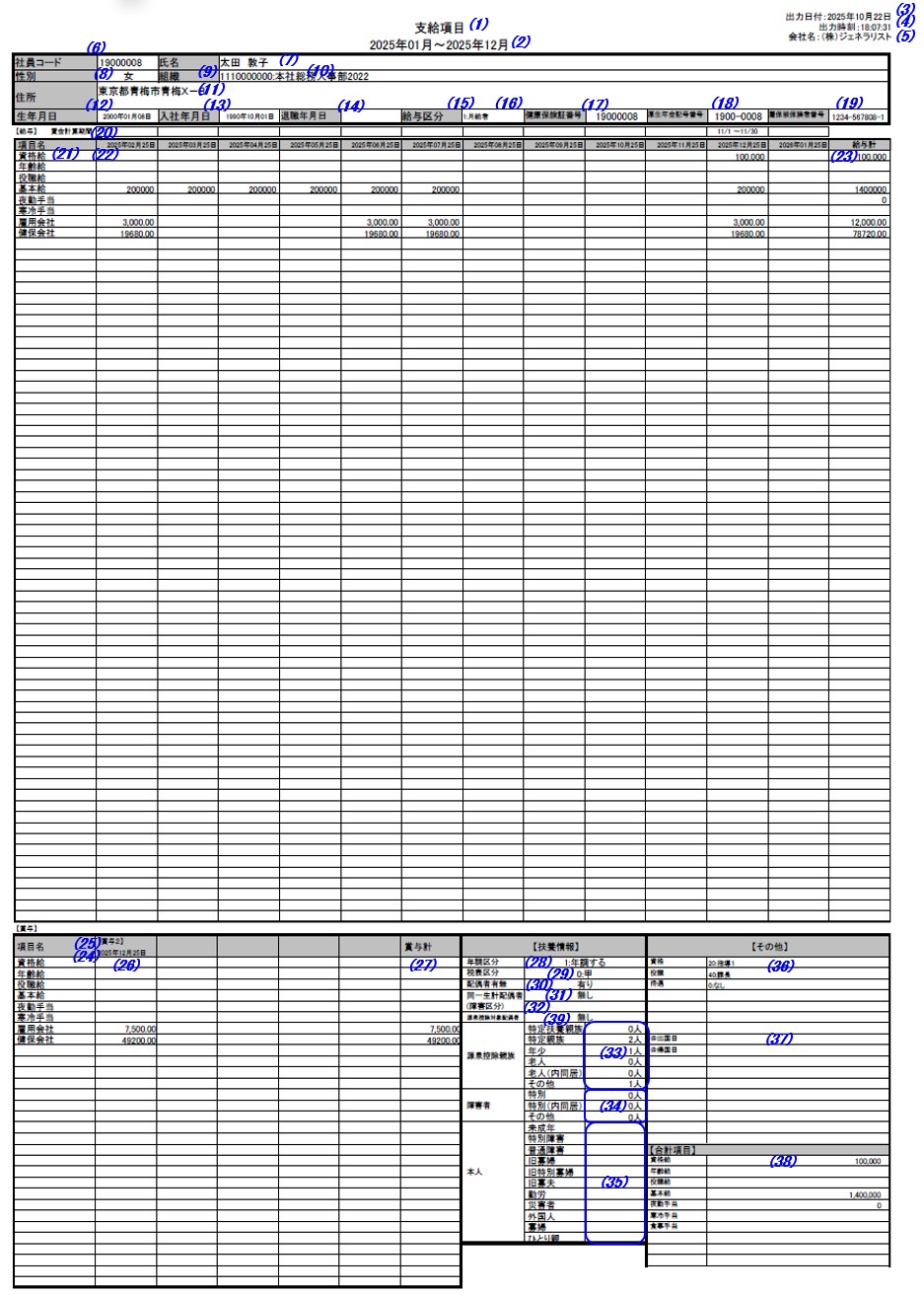 ・ 帳票ヘッダ部分、給与・賞与の項目名称、扶養情報、その他には対象期間終了時点のデータを印字します。
