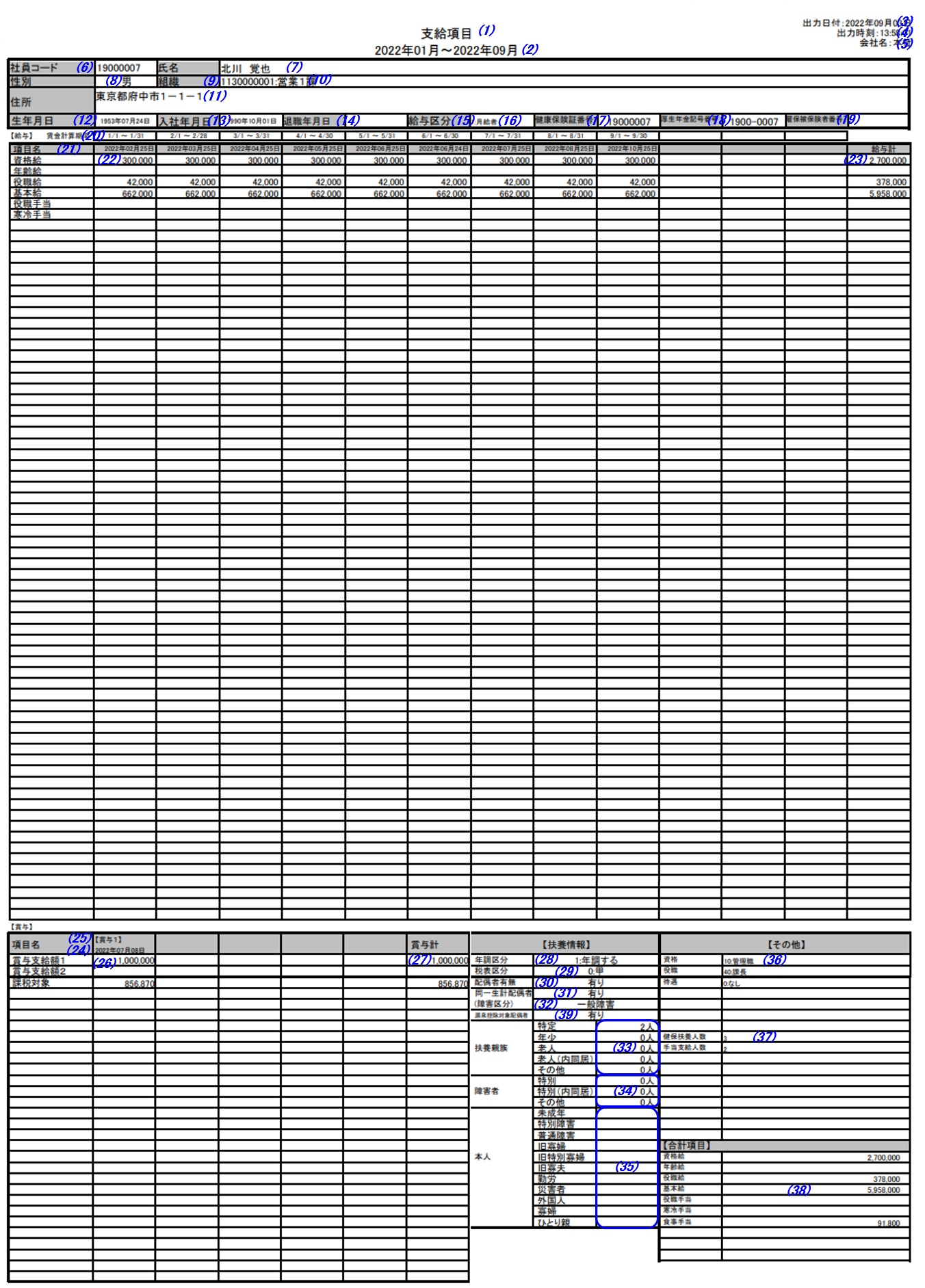社員基本情報登録>賃金台帳 印刷P設定(縦型)で設定した項目の値 |