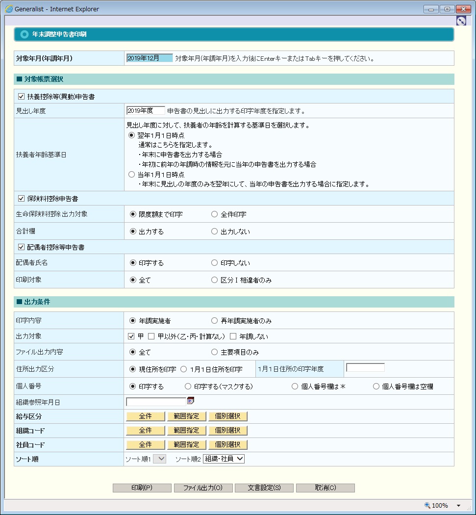 扶養控除等(異動)申告書に印字される年度を指定します。 扶養控除等(異動)申告書が選択されている時に必須項目となります。 |