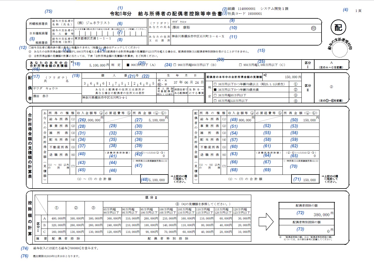 給与所得者の配偶者控除等申告書 【出力内容】 【サンプル帳票】