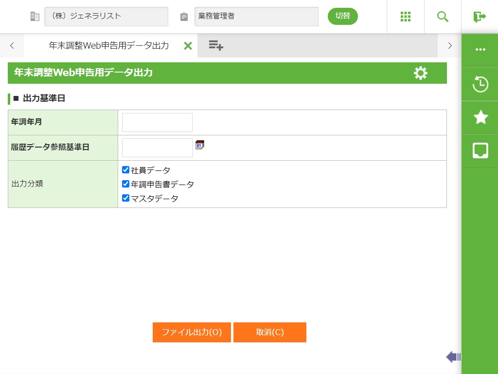 「年末調整Web申告」システムへデータを連携するため、社員データや年末調整の申告書データ、およびマスタデータのファイル出力を行います。