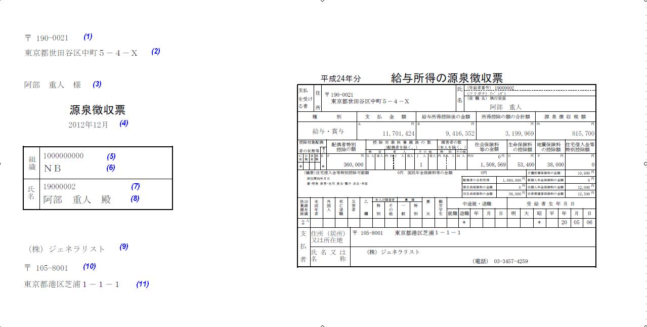 源泉徴収票(出力方法として[1 頁に2 人分]種別として[税務署・個人用]を選択した場合)【ファイルレイアウト】 【サンプルファイル】