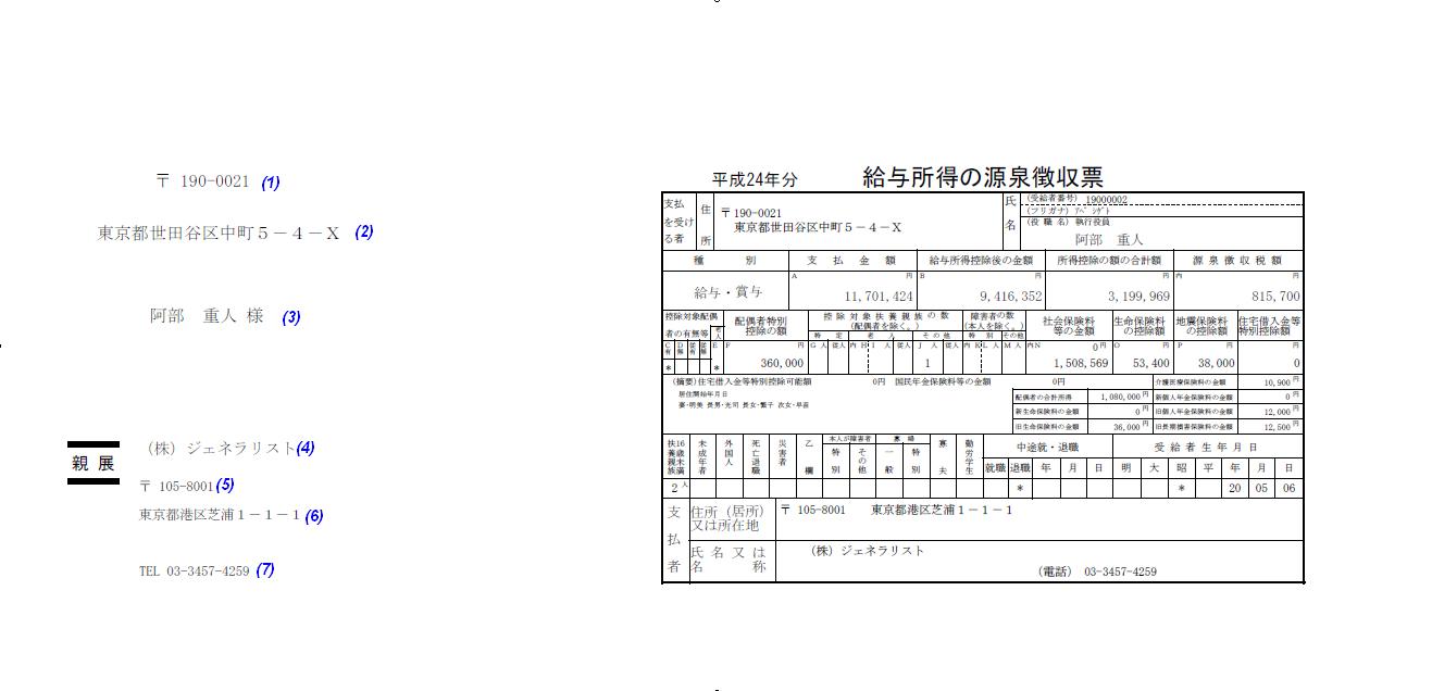 「税務署用の印字住所」「個人用の印字住所」にて「現住所を印字」を選択した場合 社員基本情報登録>郵便番号 「税務署用の印字住所」「個人用の印字住所」にて「1月1日住所を印字」を選択した場合 社員1月1日住所情報登録>郵便番号 |