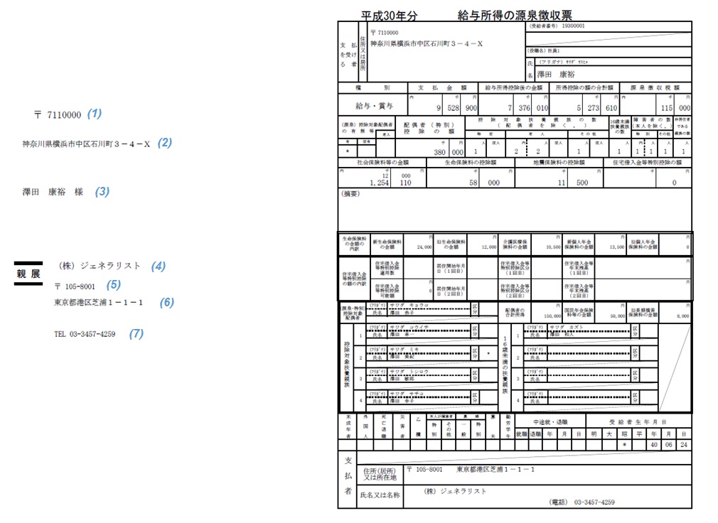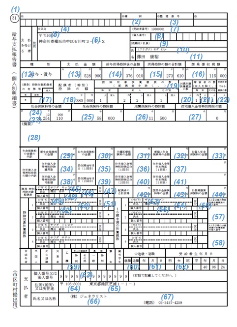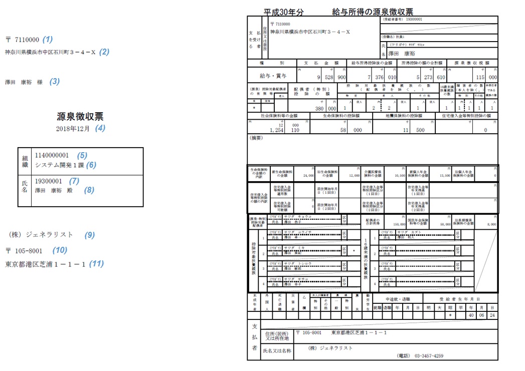 源泉徴収票(出力方法として[1 頁に1 人分]種別として[税務署・個人用]を選択した場合)【ファイルレイアウト】 【サンプルファイル】