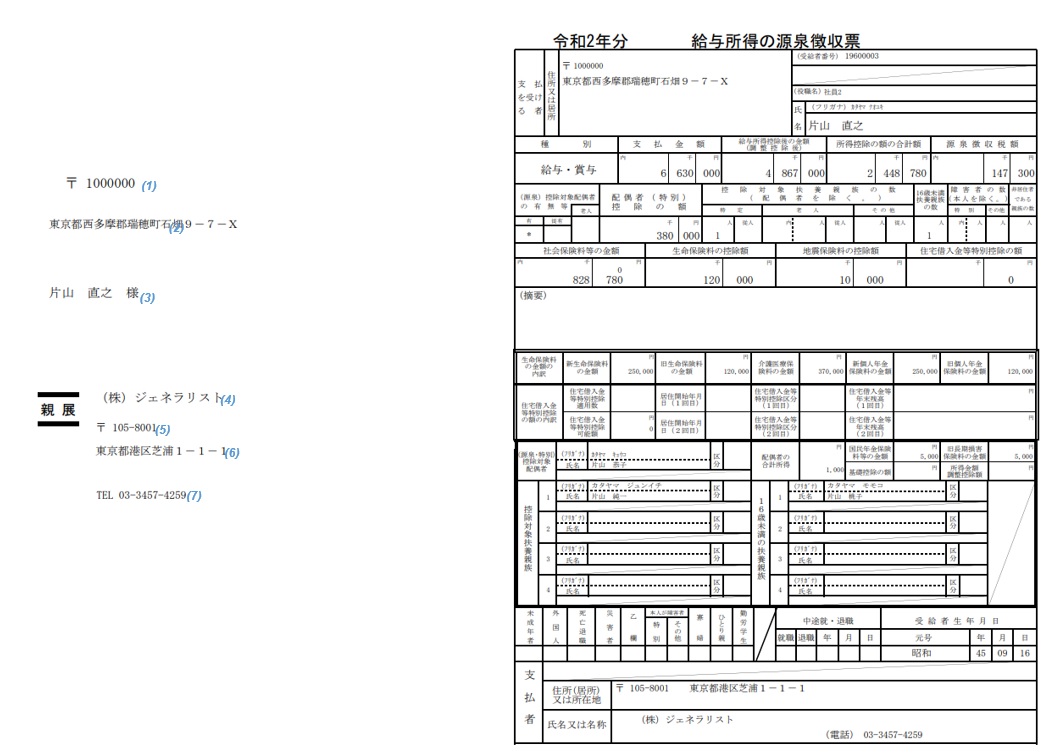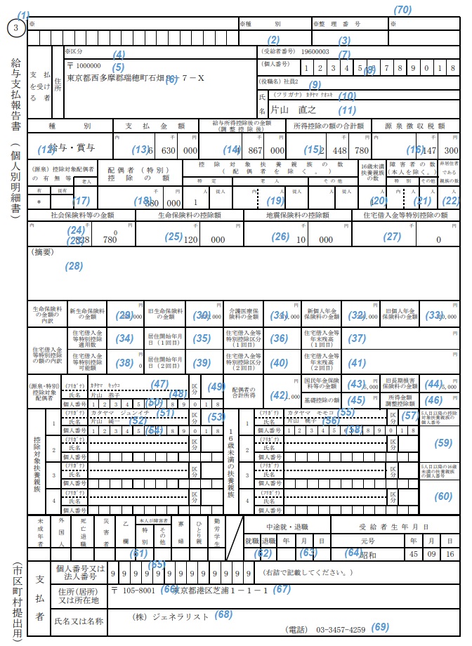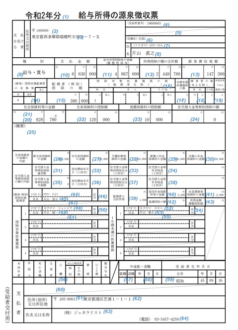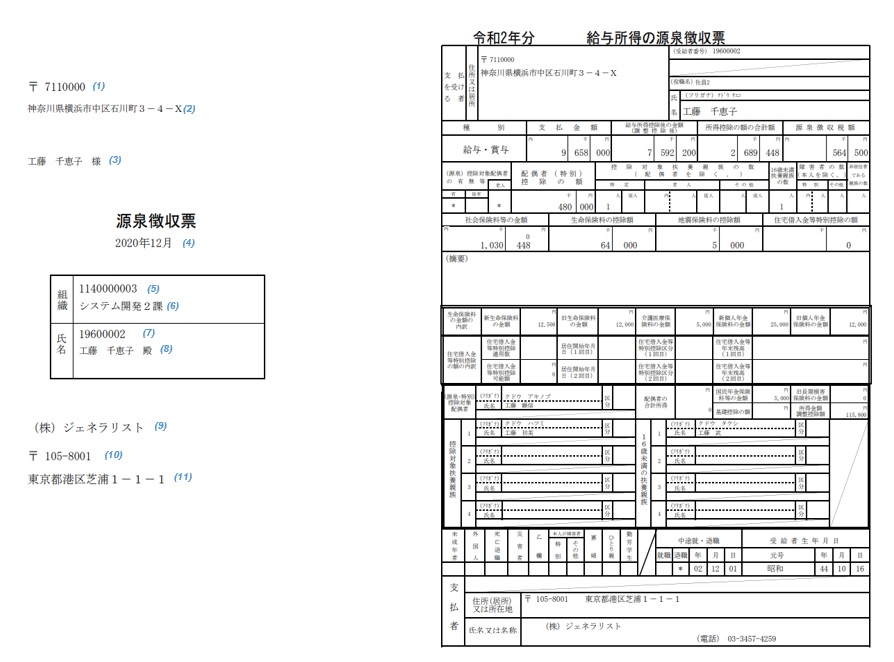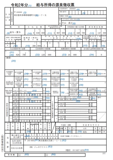 源泉徴収票(出力方法として[1 頁に1 人分]種別として[税務署・個人用]を選択した場合)【ファイルレイアウト】 【サンプルファイル】