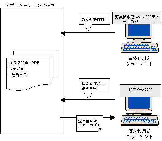 ・ 本機能であらかじめ作成した源泉徴収票のPDFファイルは、個人ログインした利用者が「帳票Web公開(1.3.5)」から閲覧することができます。以下の図に、本機能の概要を示します。PDFファイルは、アプリケーションサーバ上に作成またはデータベースのテーブルに保存することができます。詳細はインストール手順書の「付録C 帳票Web配信の設定について」を参照してください。
