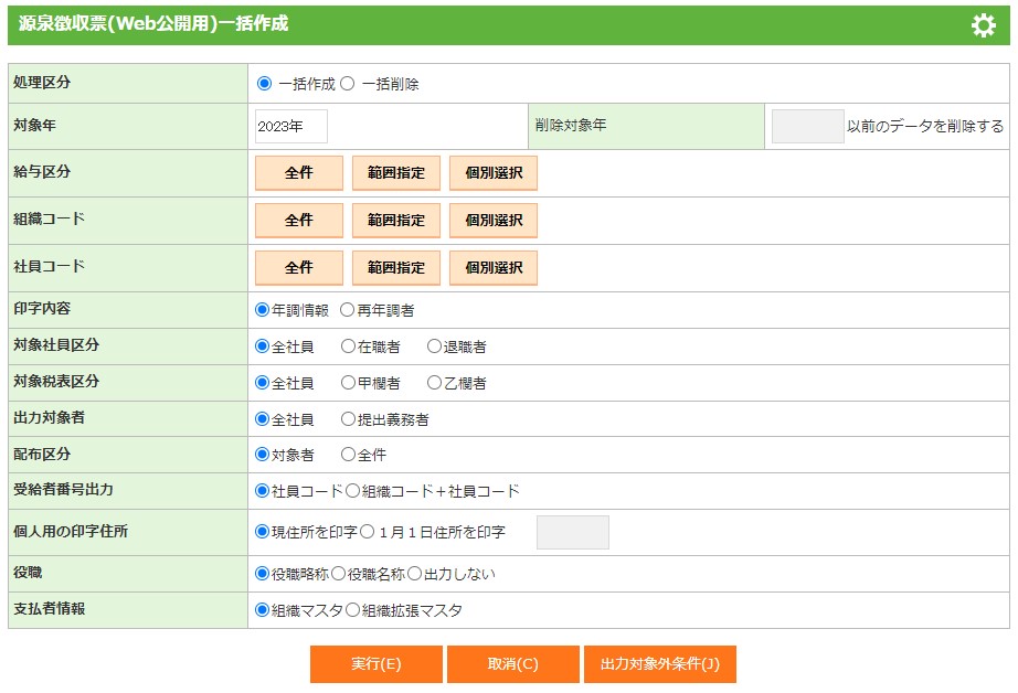 ・ 現在処理年月時点の社員明細書配布情報登録(3.1.52)の源泉徴収票配布区分が「Web配信」または「メール配信」の社員
