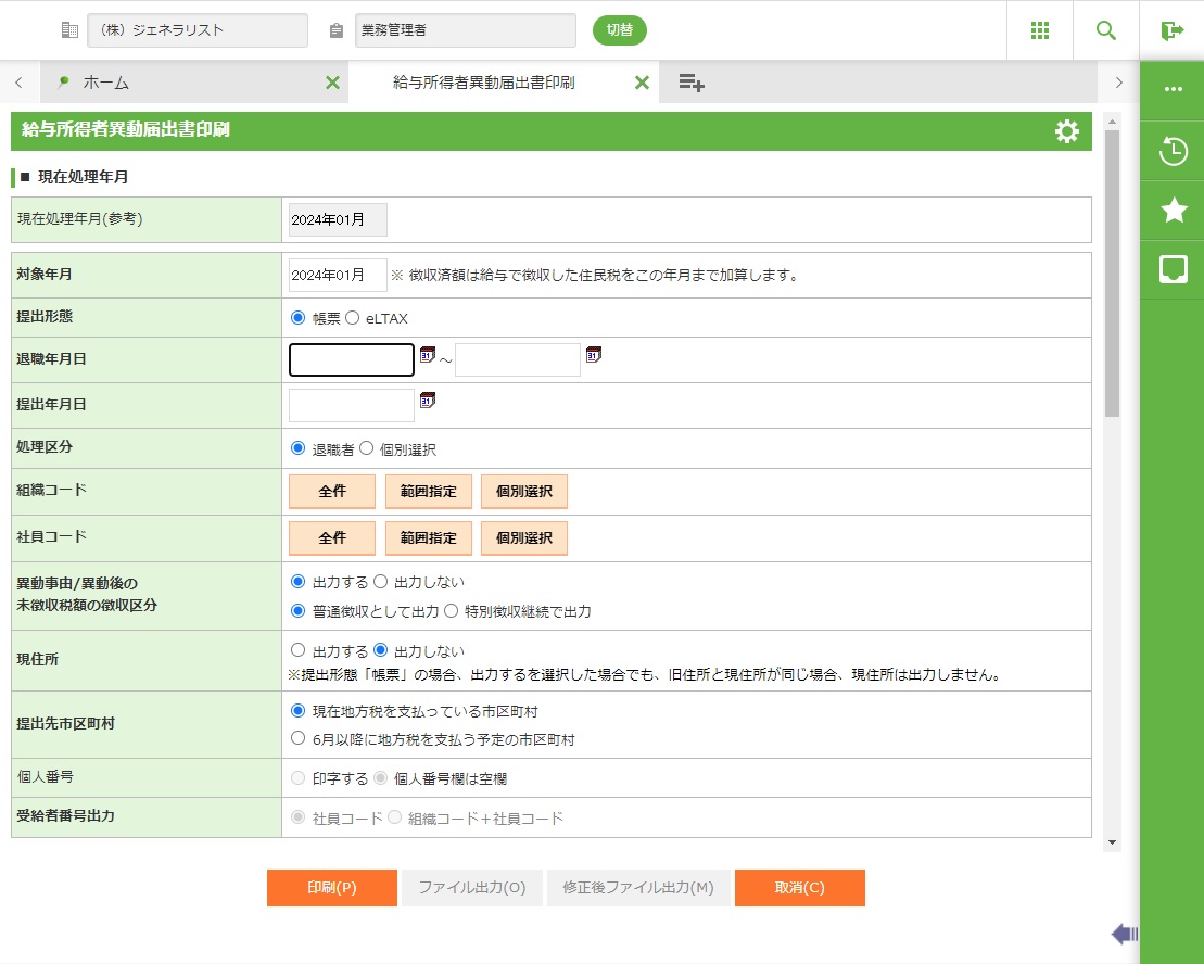 ・住所変更がない場合は出力対象となりませんので、必要に応じて提出形態「帳票」の個別選択で出力してください。