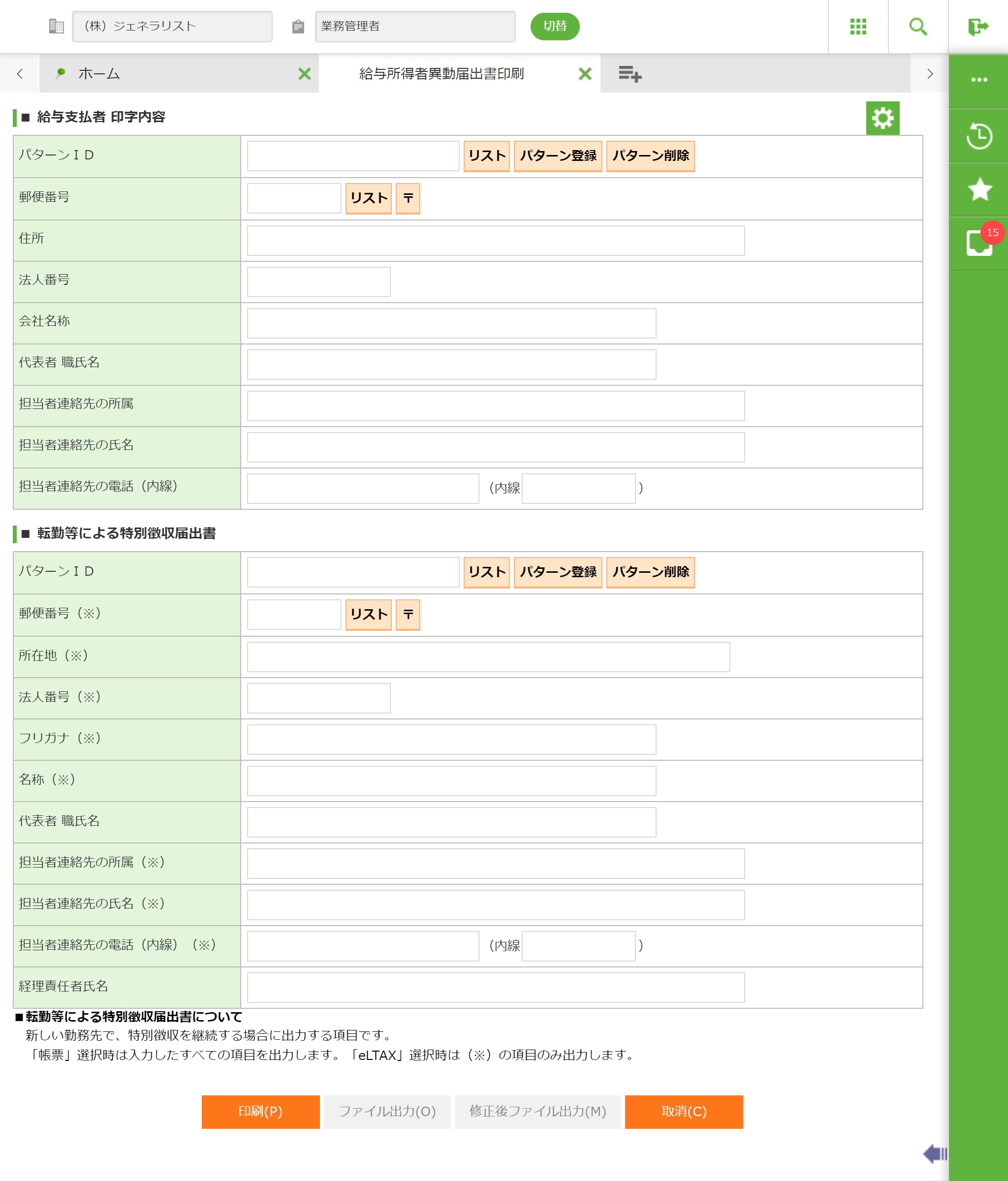 ・ 「給与支払者の個人番号又は法人番号」欄に個人番号が必要な場合は、法人番号を空欄のまま帳票を出力し、個人番号を手書きしてください。
