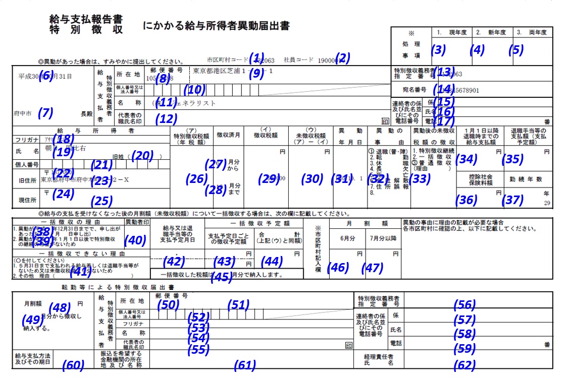 【帳票出力項目「異動後の未徴収税額の徴収」(番号33)が『2.一括徴収』かつ、帳票出力項目「異動年月日」(番号31)の月が「1〜5月」の場合】 |