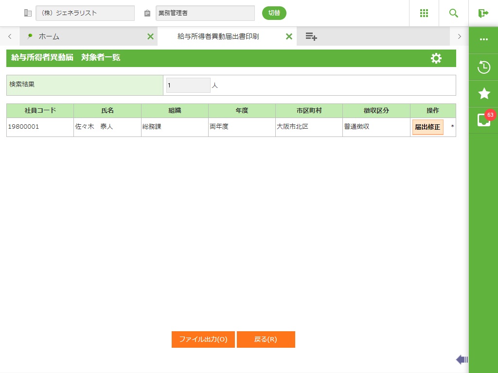 一覧に表示されている社員のデータを届出データとして出力します。 |