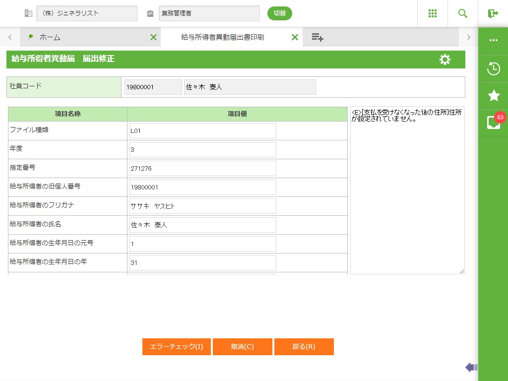 | エラーチェック(I) | 届出データに編集結果を一時保存し、エラーチェックします。 |