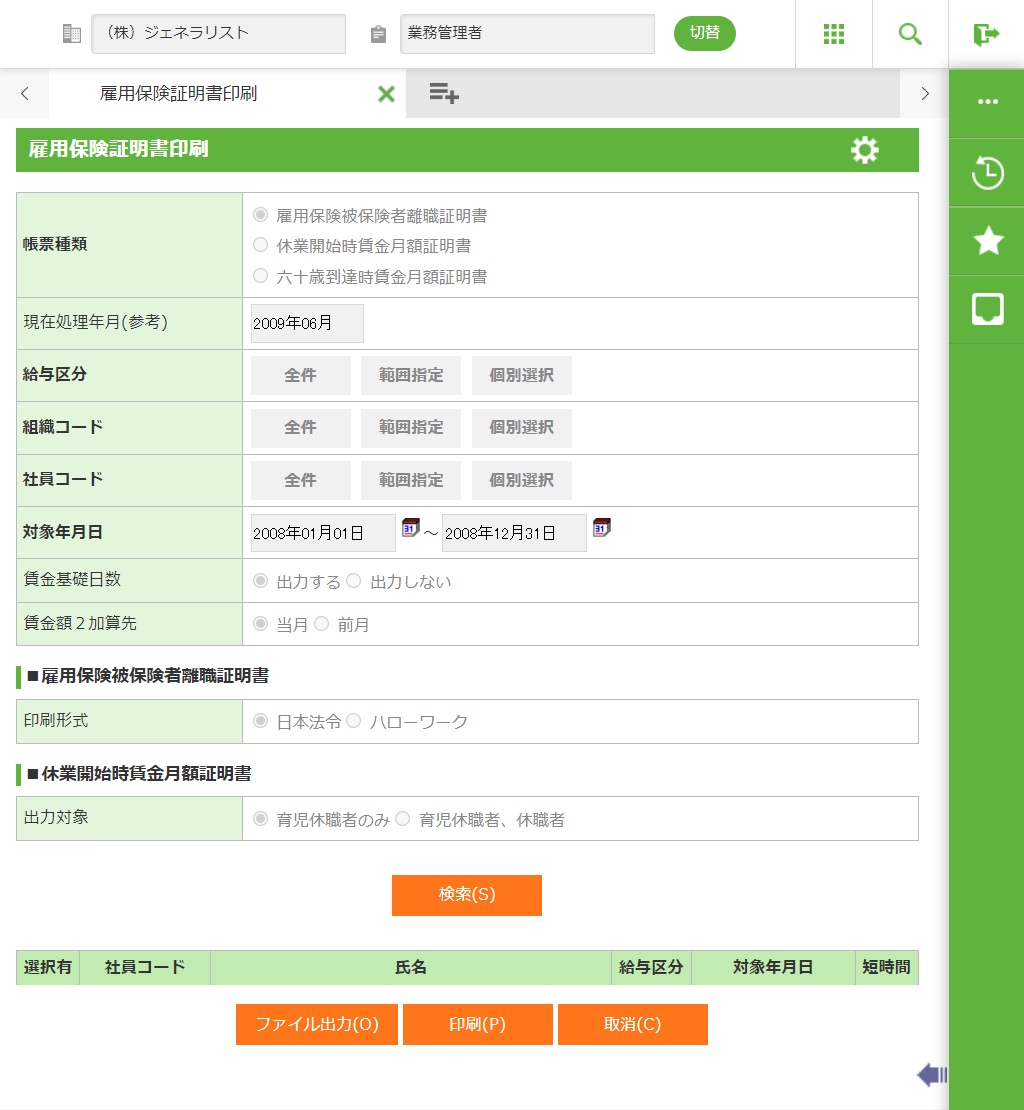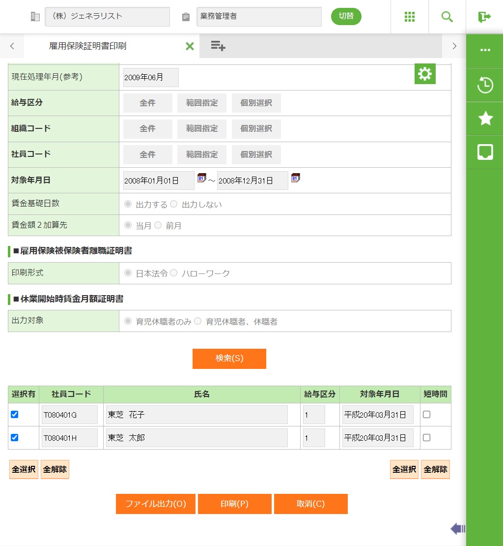 60歳以上で雇用保険に5年以上加入している社員の一覧が表示されますので、出力対象者を選択し、処理を実行してください。短時間労働者の場合は、短時間のチェックボックスをオンにしてください。(短時間労働者:週30時間未満勤務の労働者)