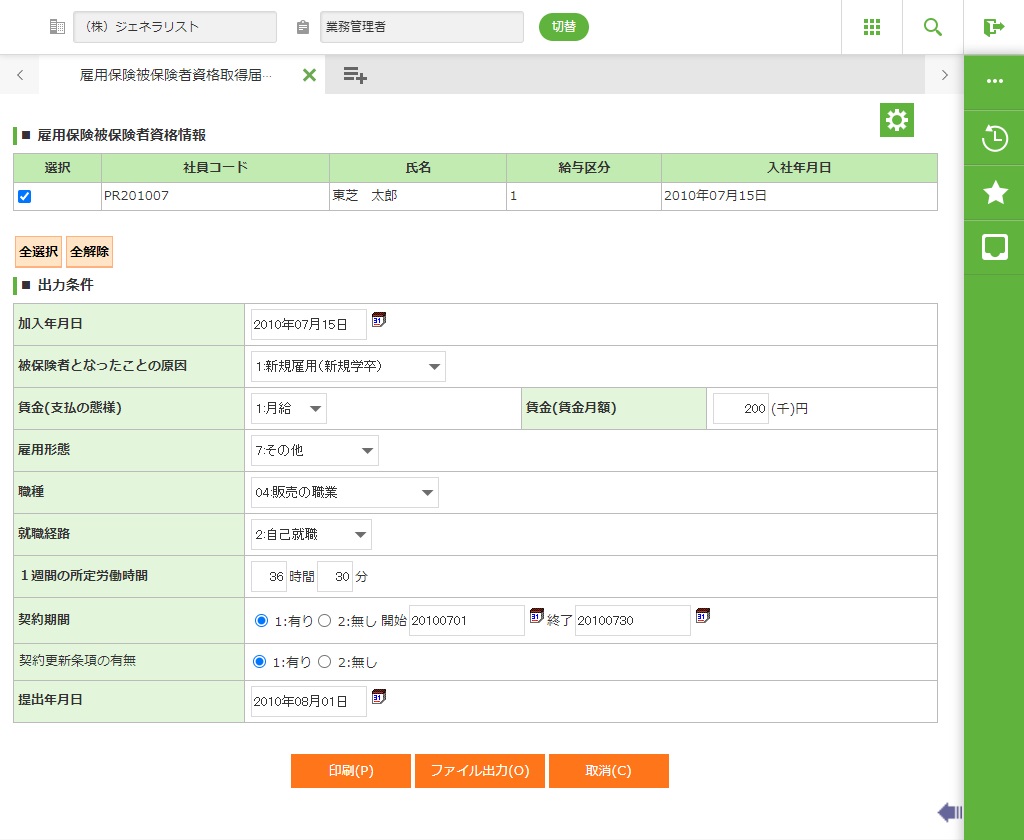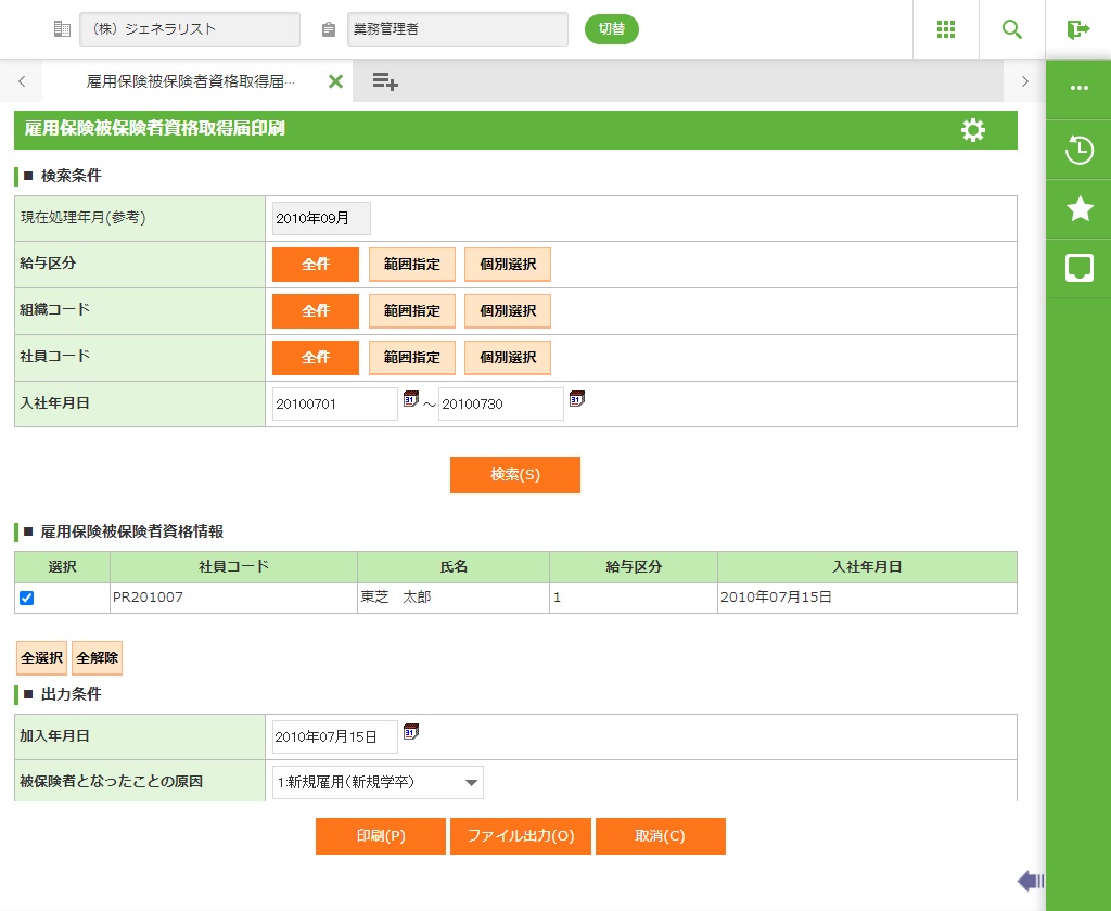雇用保険被保険者資格取得届印刷を、帳票の出力及び、CSVファイルの出力をします。