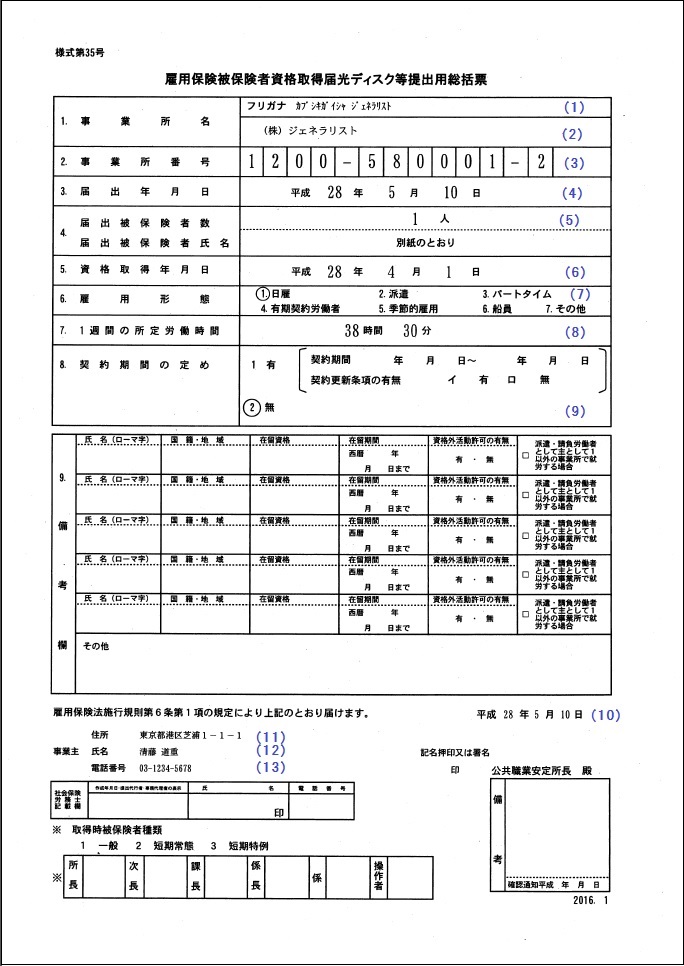 雇用保険被保険者資格取得届光ディスク等提出用総括票(A4縦) 【出力内容】 【サンプル帳票】