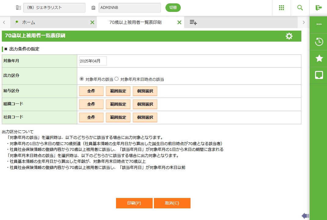 70歳到達者で厚生年金の70歳以上被用者の該当となる対象者、および予定者の一覧表を印刷します。