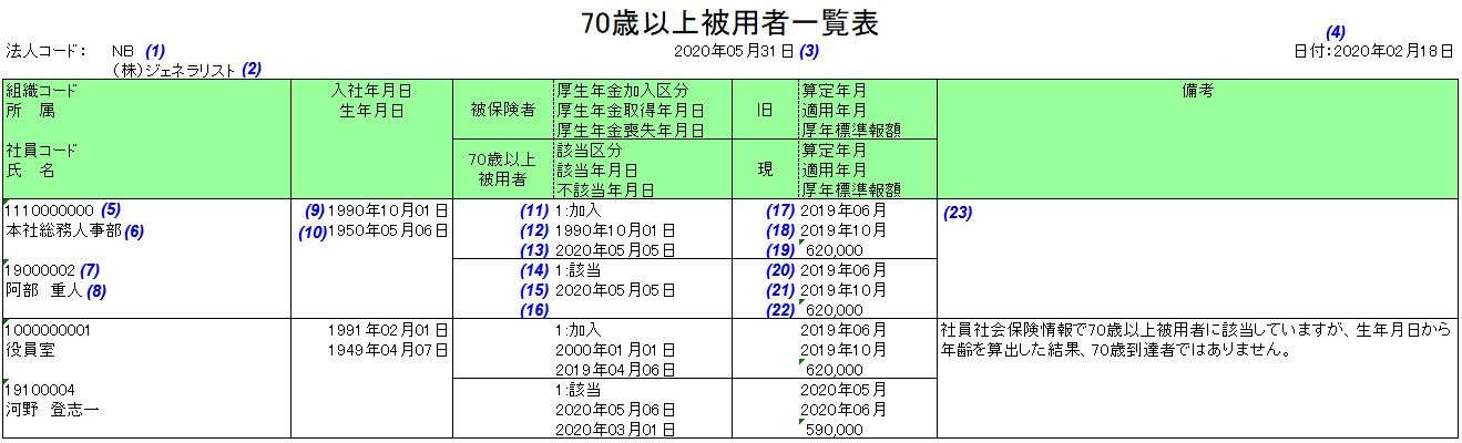 2020年3月末日時点の70歳以上被用者の該当者を出力します。