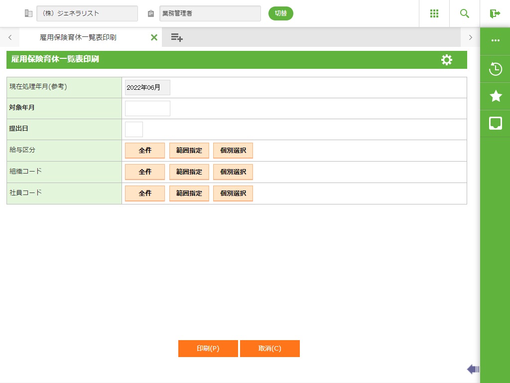 育児休業等給付の届出状況を確認するため、育児休職者及び育児時短就業者の育児休業等給付に関する情報を一覧に出力します。