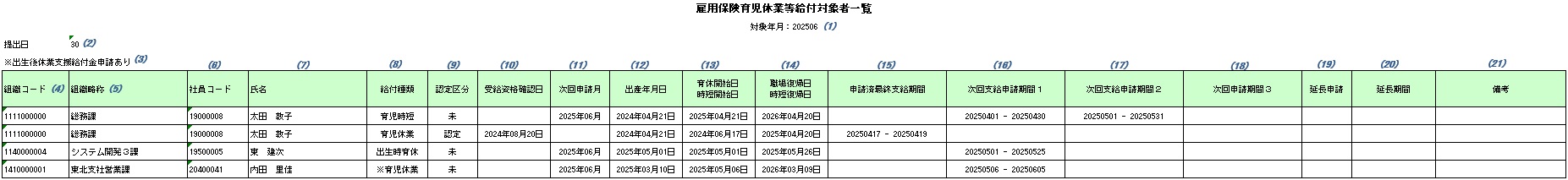雇用保険育児休業等給付対象者一覧 【出力内容】 【サンプル帳票】