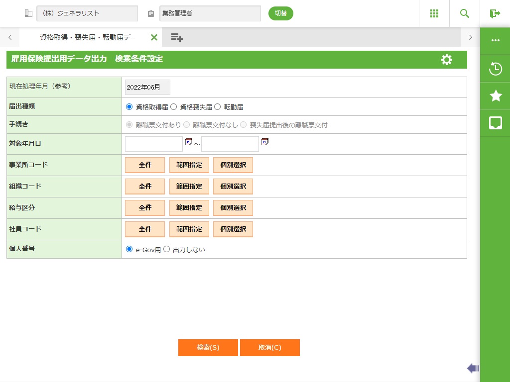 ・ 第1画面で指定した対象年月日期間に、雇用保険の資格を喪失した社員を対象として第2画面を表示します。