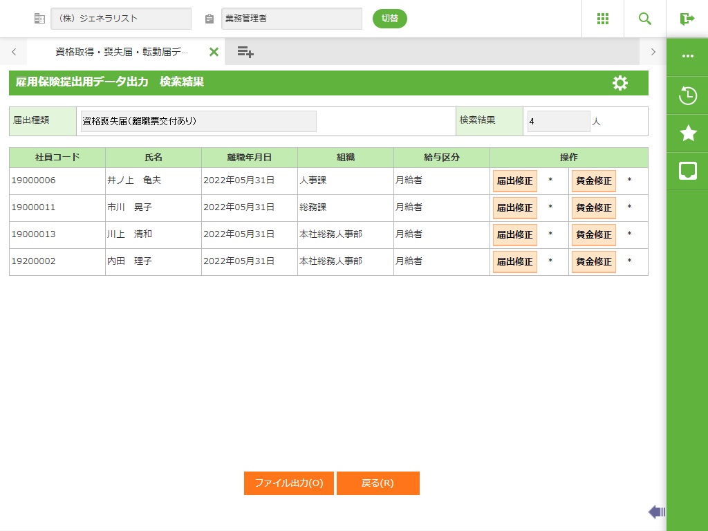 一覧に表示されている社員のデータを届出データとして出力します。 |