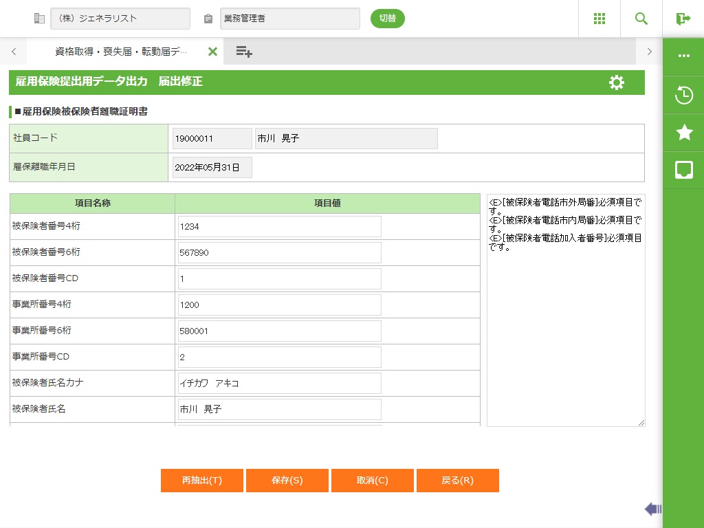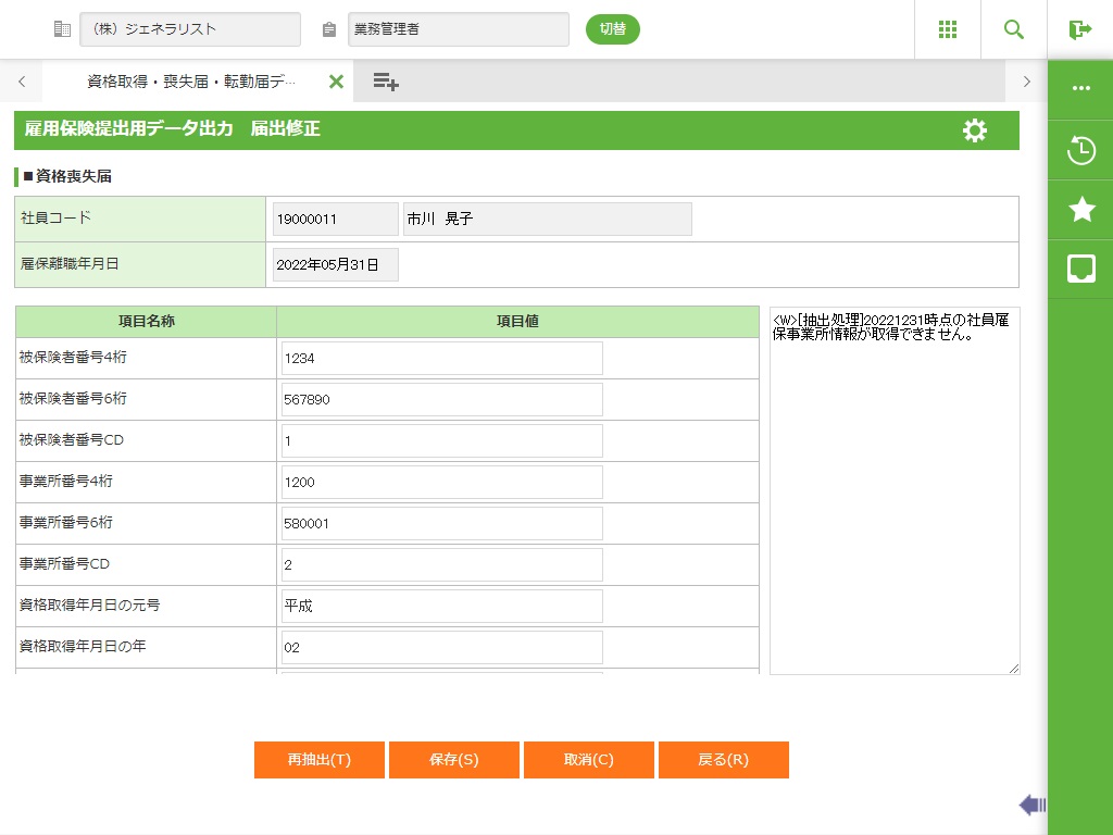 ・ 一度作成した届出データを削除することはできません。届出データを作成した社員を対象外にしたい場合は、取得年月日、喪失年月日、雇用保険事務所情報などを削除して一覧の再抽出を行ってください。 もしくは、検索条件設定画面(第1画面)で当該社員を対象外にするよう範囲指定を行い、再検索を行ってください。