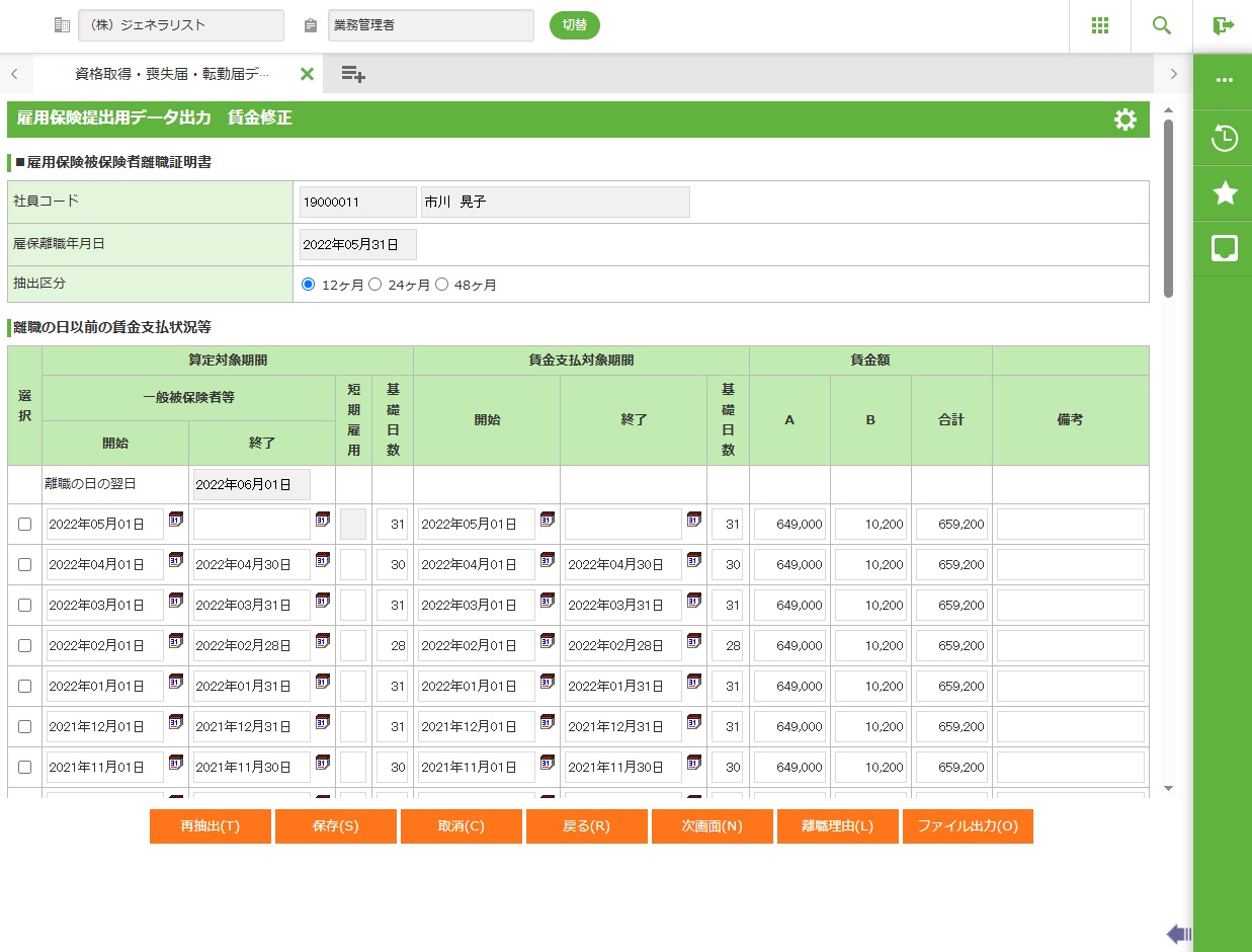 ・ 離職票は社員月額証明書情報および社員離職理由情報を合わせて出力します。