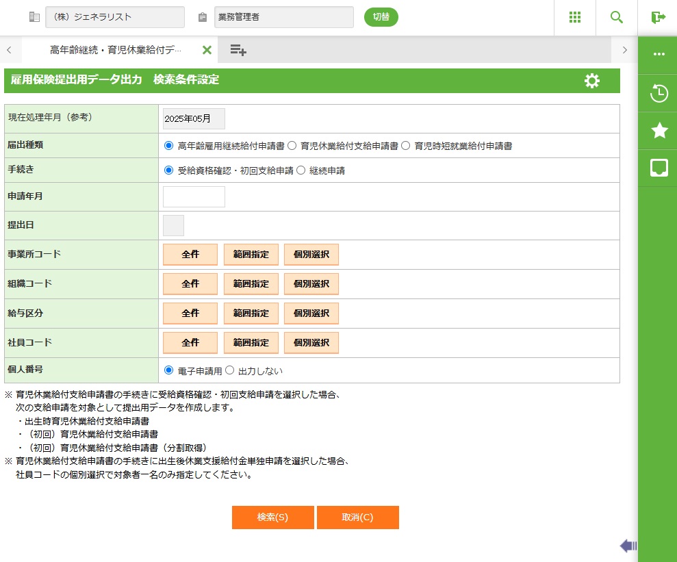 ・ 「育児休業給付金/出生後休業支援給付金支給申請書」の対象社員の抽出条件は以下のとおりです。