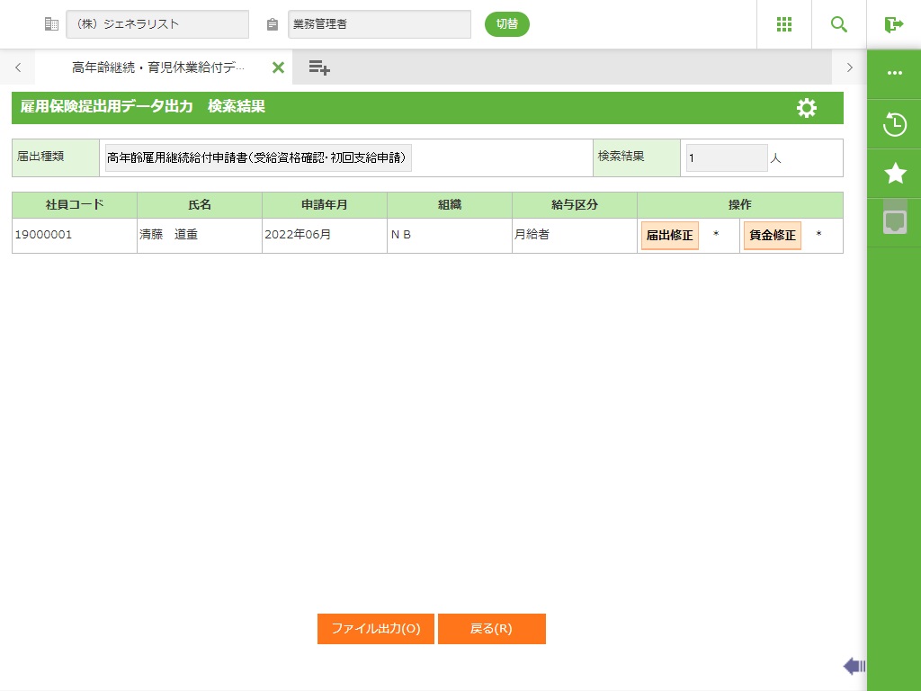 一覧に表示されている社員のデータを届出データとして出力します。 |