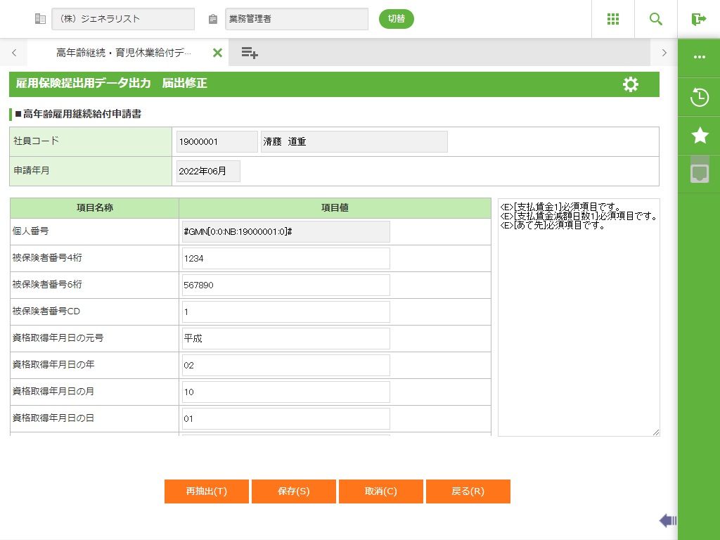 雇用保険の取得日から「休業等を開始した日」の期間が1年未満の場合、ワーニングとしてメッセージを出力します。「1.2.12 アプリケーションログ表示」で確認してください。